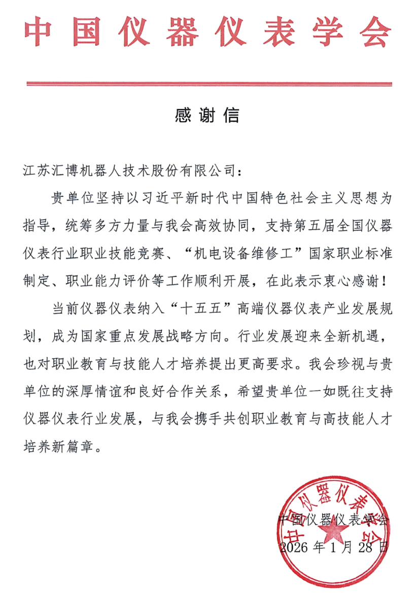 日前,江蘇匯博機器人技術股份有限公司收到中國儀器儀表學會發來的感謝信,對匯博機器人在第五屆全國儀器儀表行業職業技能競賽、“機電設備維修工”國家職業標準制定、職業能力評價等工作中的全力支持與高效協同致以衷心謝意,高度認可公司在儀器儀表行業技能人才培育與產業規范化發展中作出的積極貢獻。