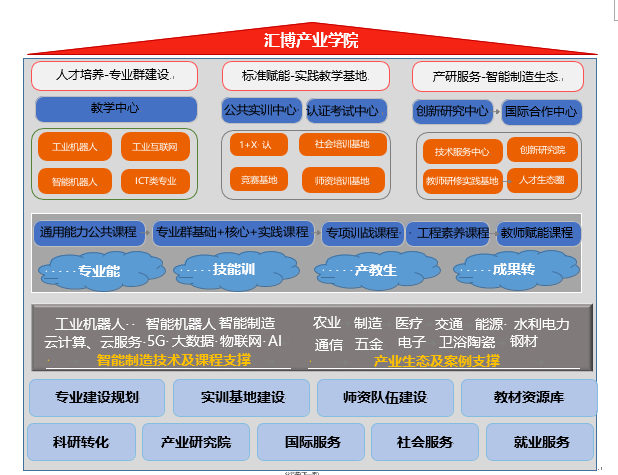 匯博產業學院深耕智能制造業賦能教育,學院在“政校企三位一體辦學、工學評三位一體培養和技藝道三位一? ?體成才”的教育理念下致力于智能制造、人工智能技術在我國的普及與應用,為我國智能制造業提供技術支撐和人才保障, 促進產業升級和發展。